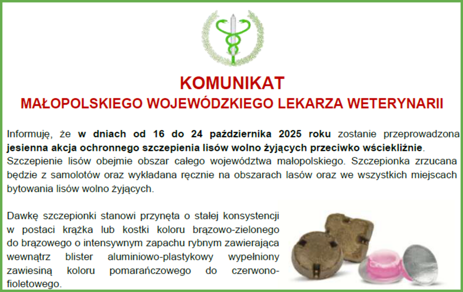 Małopolski Wojewódzki Lekarz Weterynarii informuje, że w dniach od 16 do 24 października 2025 roku zostanie przeprowadzona jesienna akcja ochronnego szczepienia lisów wolno żyjących przeciwko wściekliźnie. Szczepienie lisów obejmie obszar całego województwa małopolskiego. Szczepionka zrzucana będzie z samolotów oraz wykładana ręcznie na obszarach lasów oraz we wszystkich miejscach bytowania lisów wolno żyjących.