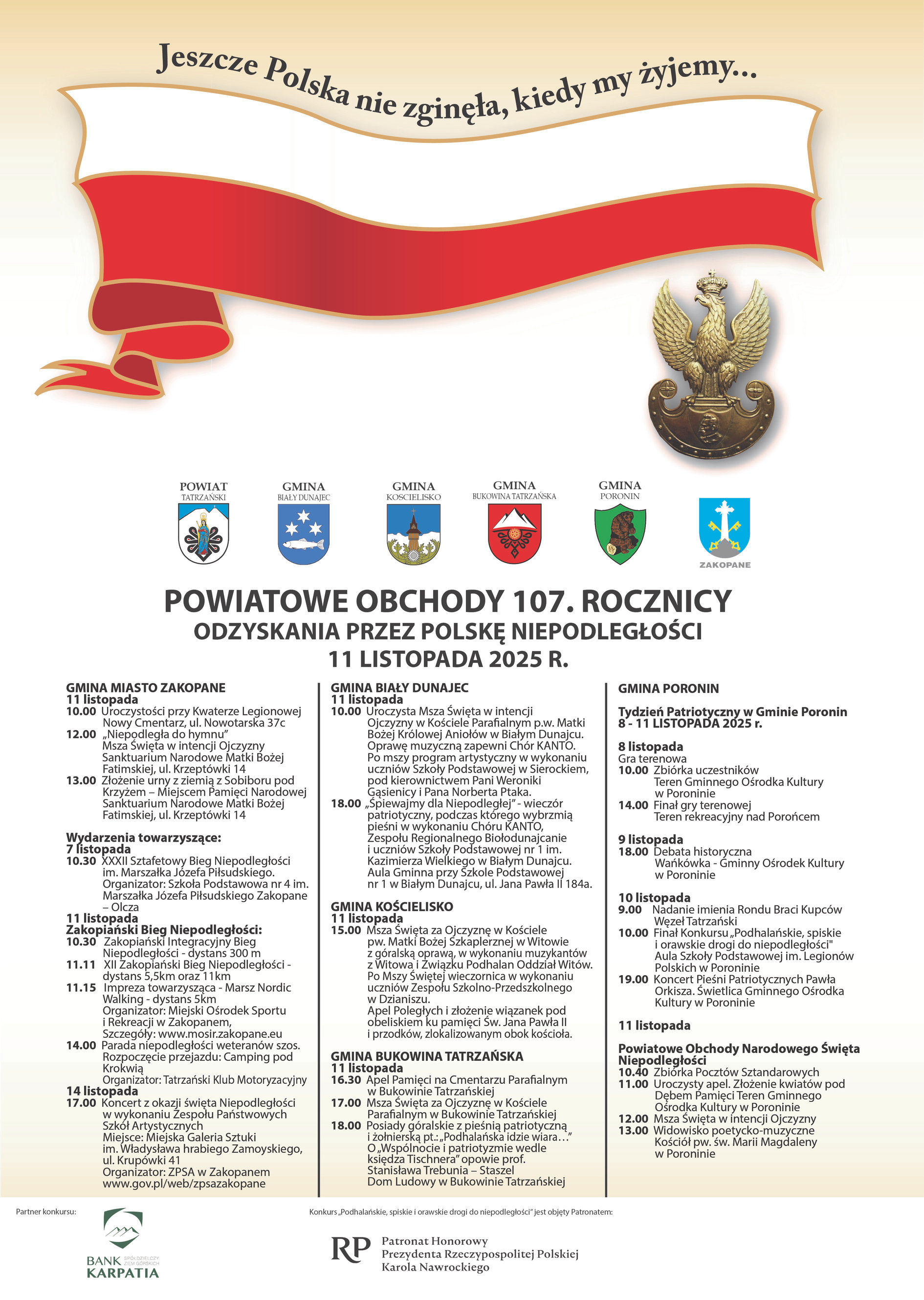 Zapraszamy do zapoznania się z programem uroczystości i wydarzeń towarzyszących Obchodów 107. Rocznicy Odzyskania Niepodległości przez Polskę, które w dniach 7 - 11 listopada są organizowane we wszystkich gminach Powiatu Tatrzańskiego. Powiatowe Obchody Narodowego Święta Niepodległości odbędą się w tym roku w Gminie Poronin, poprzedzi je Tydzień Patriotyczny oraz finał konkursu historycznego dla młodzieży „Podhalańskie, spiskie i orawskie drogi do niepodległości”.