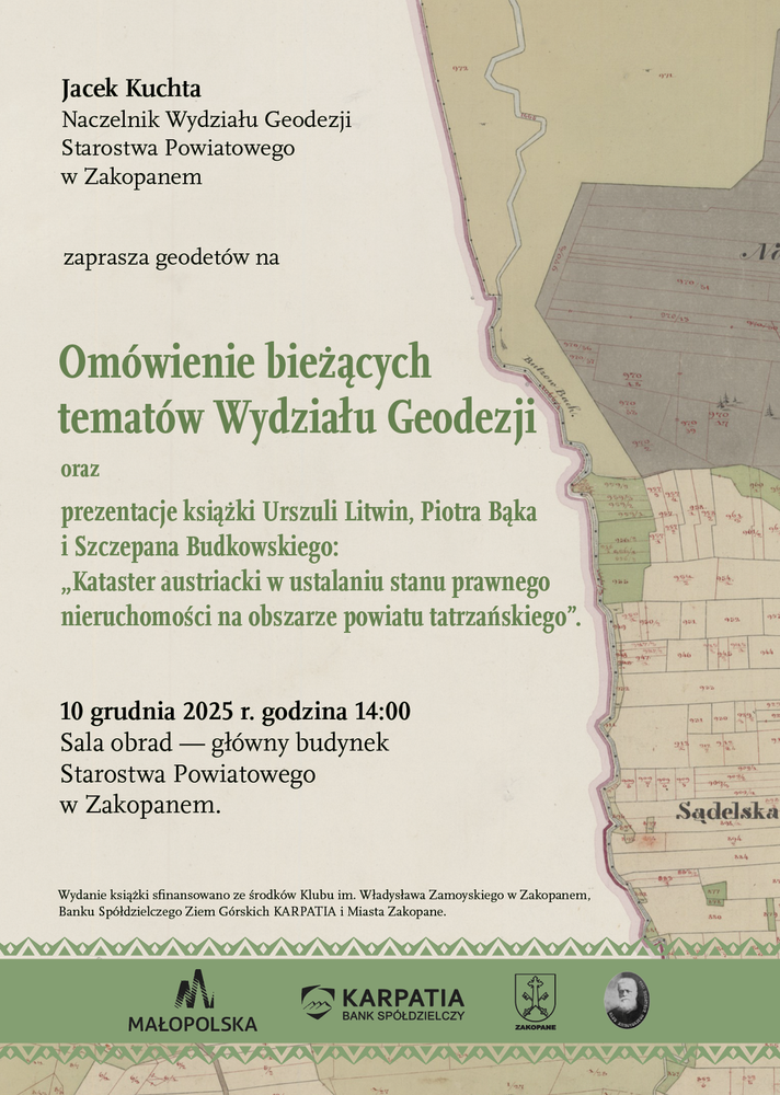 Naczelnik Wydziału Geodezji Starostwa Powiatowego w Zakopanem Jacek Kuchta zaprasza geodetów na omówienie bieżących tematów Wydziału Geodezji oraz prezentację książki Urszuli Litwin, Piotra Bąka i Szczepana Budkowskiego "Kataster austriacki w ustalaniu stanu prawnego nieruchomości na terenie powiatu tatrzańskiego" - 10 grudnia 2025 r. godz. 14:00, sala obrad w budynku głównym Starostwa Powiatowego w Zakopanem.