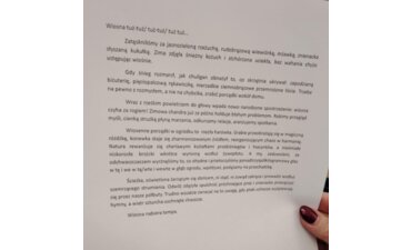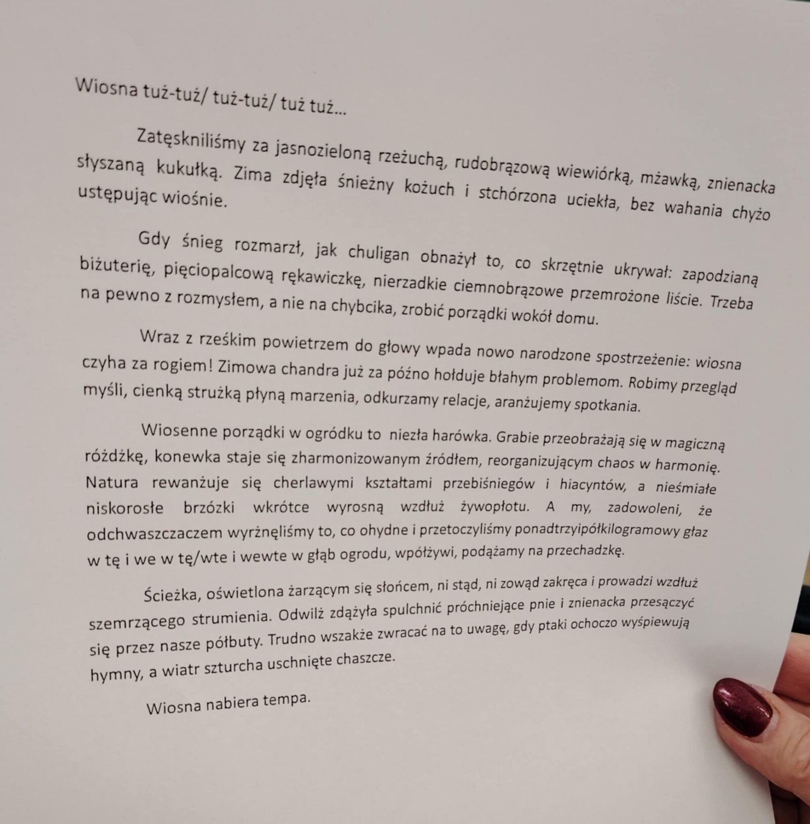 Tekst pod tytułem "Wiosna tuż-tuż" ukazał ucieczkę stchórzonej zimy, nie na chybcika robione porządki, rześkie powietrze, cherlawe kształty hiacyntów i niskorosłe brzózki, bo przecież wiosna nabiera tempa!