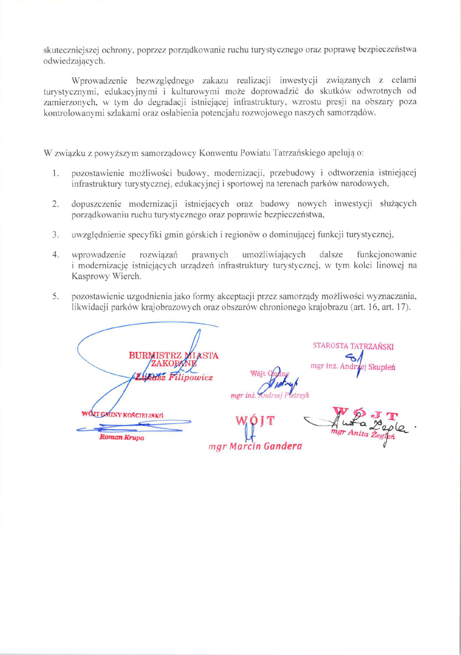 Konwent Powiatu Tatrzańskiego, reprezentujący jednostki samorządu terytorialnego Powiatu Tatrzańskiego, wyraża stanowczy niepokój i głębokie zaniepokojenie projektowanymi zmianami ustawy o ochronie przyrody, w szczególności proponowanym brzmieniem art. 15 ust. 3 pkt 1a, art. 16, 17, które wyłączają możliwość realizacji inwestycji związanych z celami edukacyjnymi, kulturowymi, turystycznymi, rekreacyjnymi, sportowymi kultu religijnego na terenie parków narodowych oraz ograniczają kompetencje samorządów.
