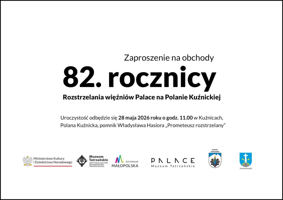 W czwartek 28 maja o godzinie 11.00 zapraszamy do wzięcia udziału w uroczystości upamiętniającej 82. rocznicę rozstrzelania więźniów, która odbędzie się na Polanie Kuźnickiej pod pomnikiem „Prometeusz Rozstrzelany”. Obchody współorganizowane są przez Muzeum Tatrzańskie, Starostwo Powiatowe w Zakopanem i Urząd Miasta Zakopane.