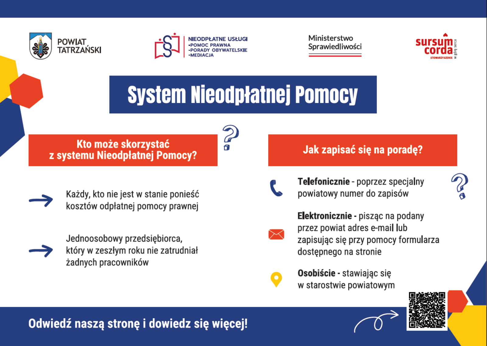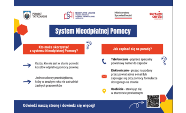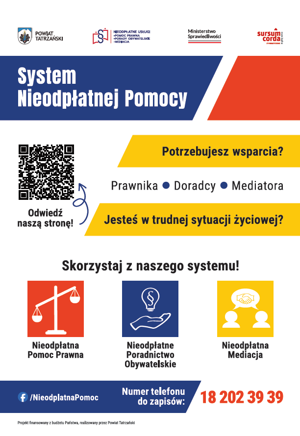 Stowarzyszenie Sursum Corda realizuje projekt powierzony przez Powiat Tatrzański, który obejmuje obszar nieodpłatnej pomocy prawnej, poradnictwa obywatelskiego oraz mediacji.