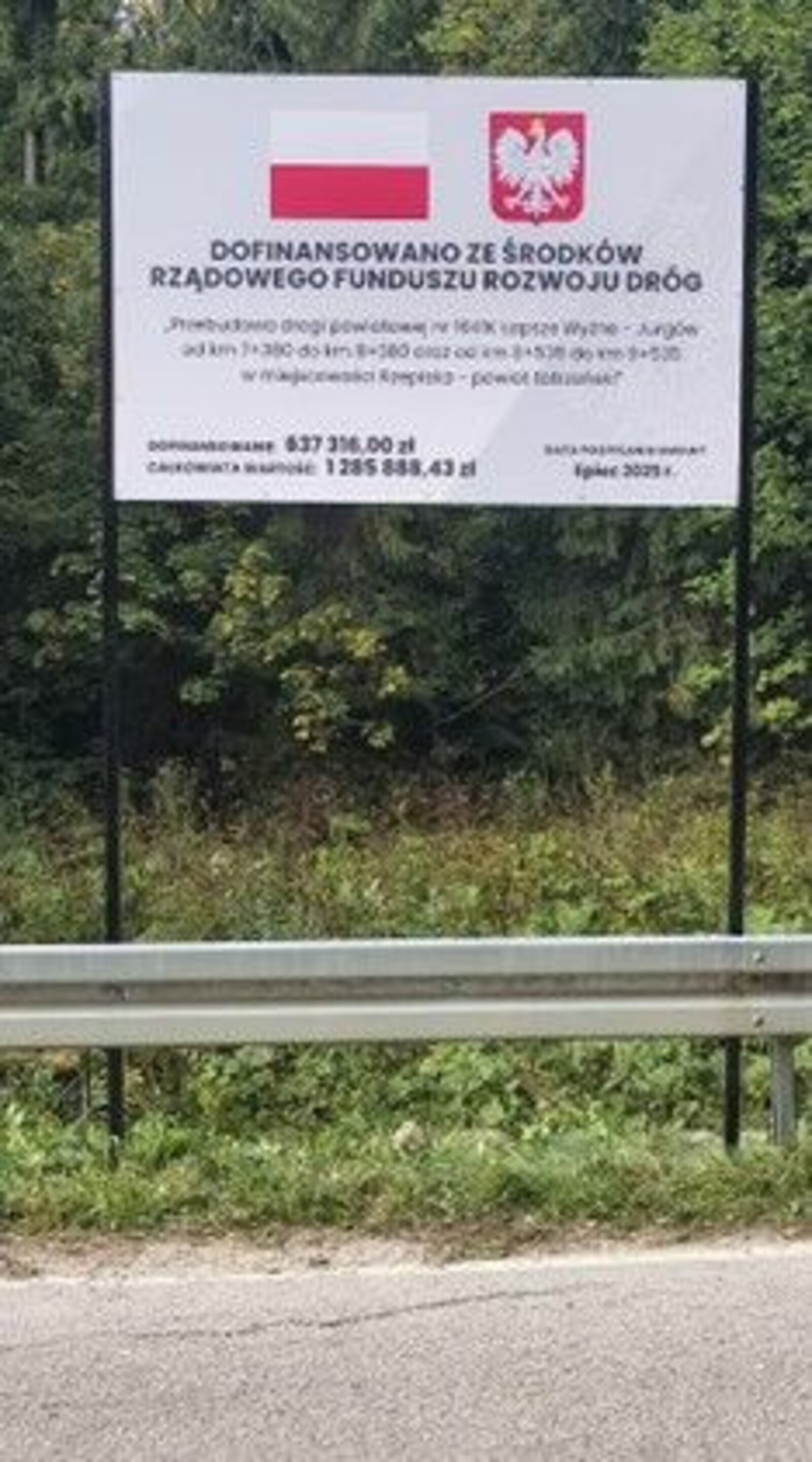 W dniu 1 września 2025 roku nastąpiło przekazanie placu budowy w/w firmie, która w ramach umowy m.in. wykona nową nawierzchnię jezdni oraz pobocza z kruszyw naturalnych. Ogółem wartość zadania wynosi 1 285 888,43 zł., w tym uzyskane dofinansowanie z Rządowego Funduszu Rozwoju Dróg wynosi 637 316,00 zł.