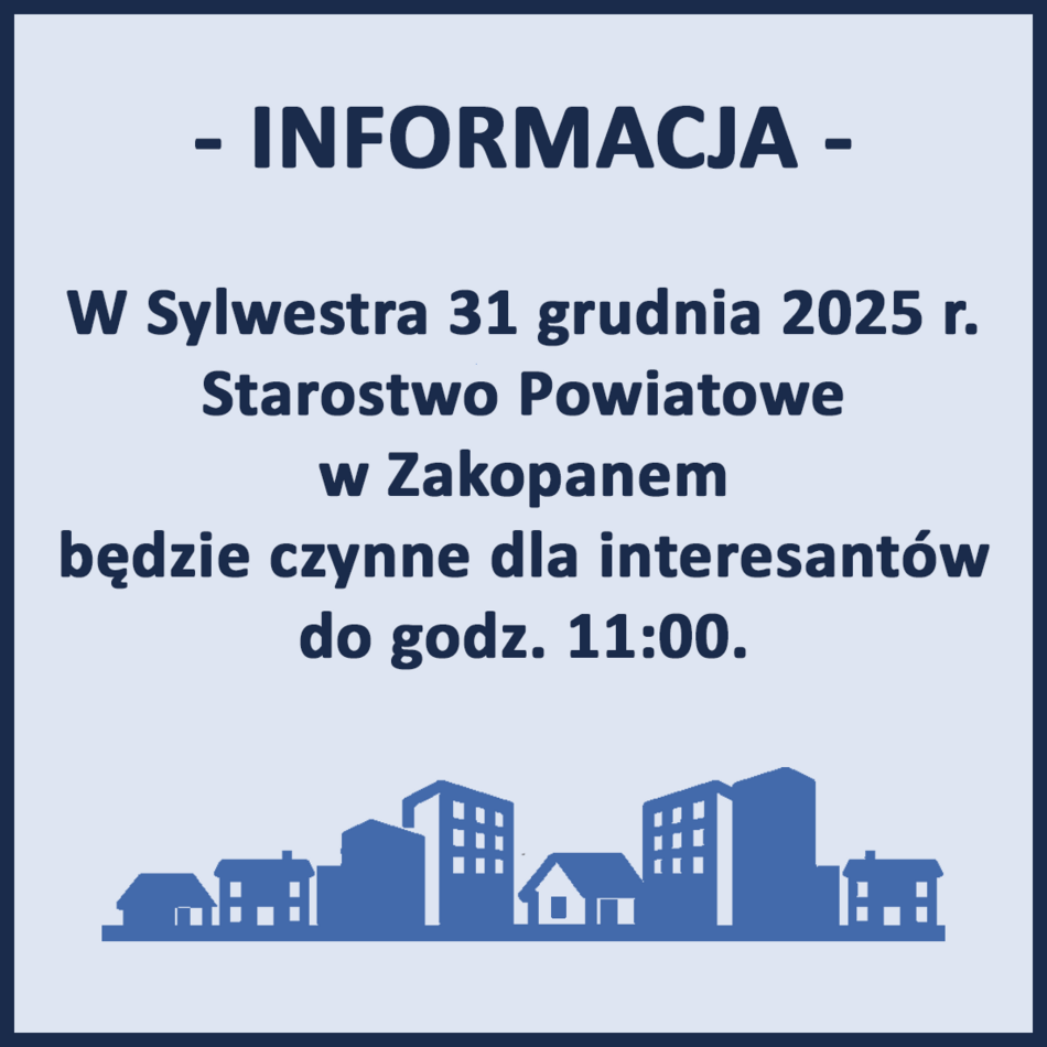 Informujemy, że w Sylwestra 31 grudnia 2025 r. w Starostwie Powiatowym godziny przyjęć interesantów zostają skrócone. Wszystkie wydziały, referaty i biura oraz kasa będą czynne do godz.11:00. Urząd będzie pracował do godz. 12:00. Punkt Nieodpłatnej Pomocy Prawnej będzie działał zgodnie z ustalonym harmonogramem wizyt do godz. 15:30.