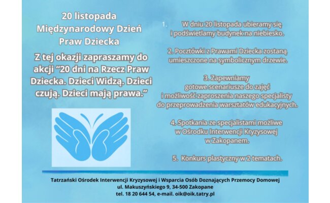 Z okazji Międzynarodowego Dnia Praw Dziecka, który obchodzimy 20 listopada, Tatrzański Ośrodek Interwencji Kryzysowej organizuje akcję...
