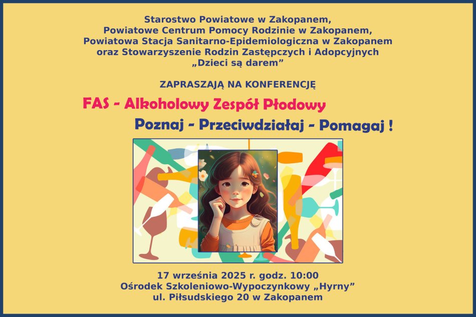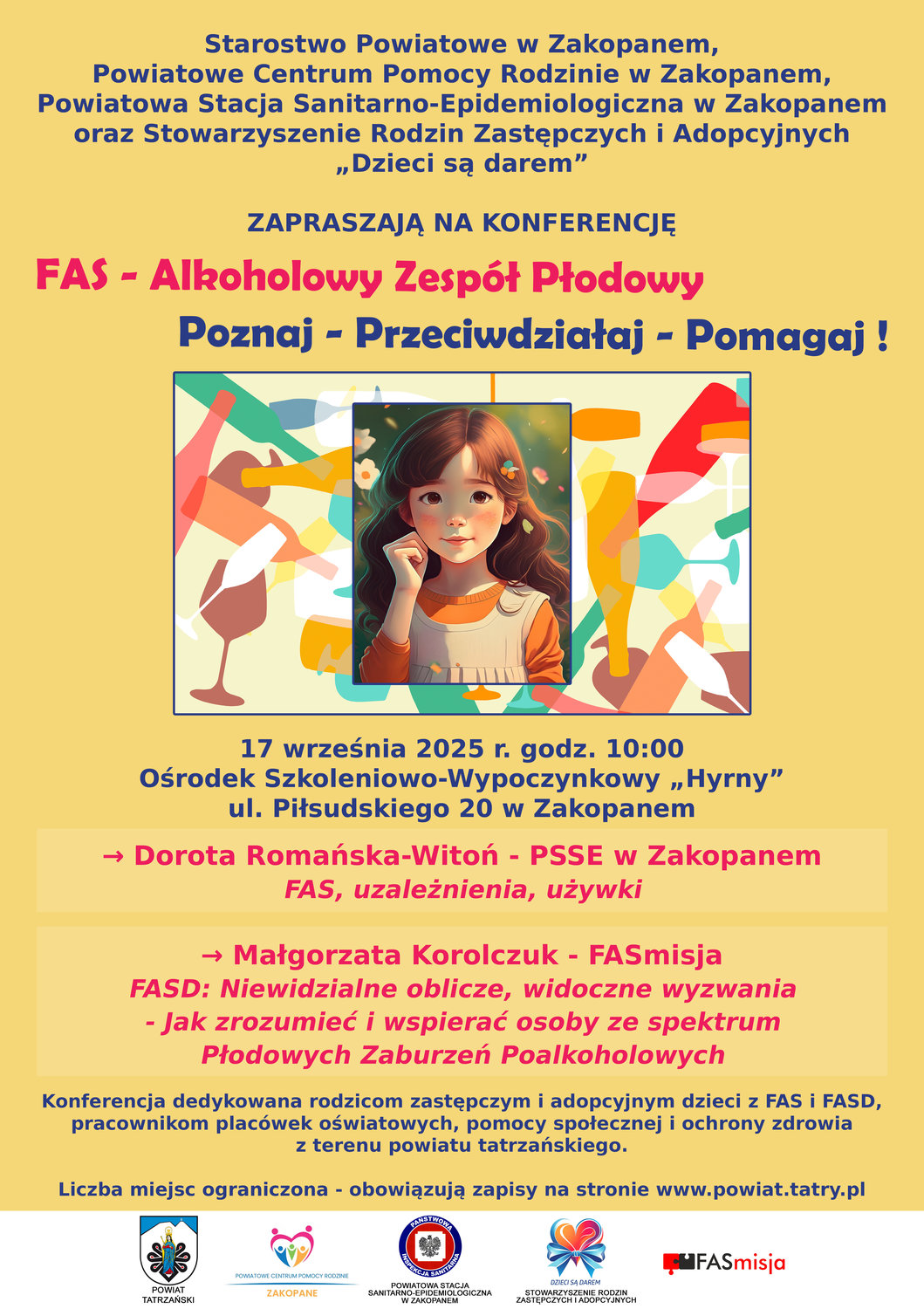 Starostwo Powiatowe w Zakopanem, Powiatowe Centrum Pomocy Rodzinie w Zakopanem, Powiatowa Stacja Sanitarno-Epidemiologiczna w Zakopanem oraz Stowarzyszenie Rodzin Zastępczych i Adopcyjnych „Dzieci są darem” 17 września 2025 r. zapraszają na konferencję „FAS – Alkoholowy Zespół Płodowy”. Jest ona dedykowana rodzicom zastępczym i adopcyjnym dzieci z FAS i FASD, pracownikom placówek oświatowych, pomocy społecznej i ochrony zdrowia z terenu powiatu tatrzańskiego.
