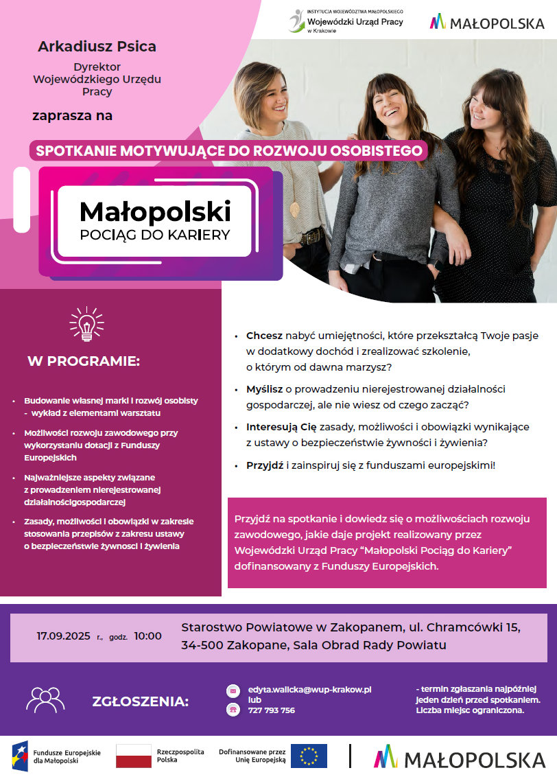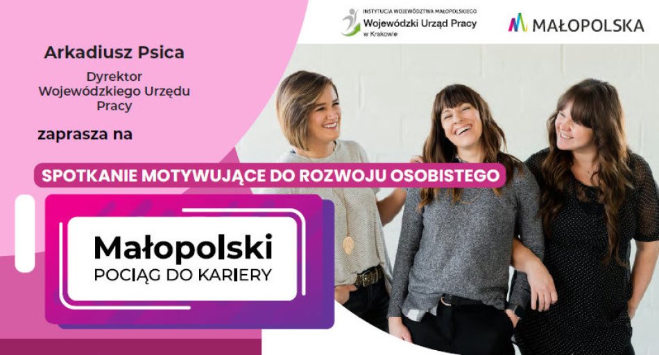 Wojewódzki Urząd Pracy w Krakowie, realizując projekt „Małopolski pociąg do kariery – sezon 1” organizuje cykl spotkań świadomościowych dedykowanych pracującym Małopolanom, w tym szczególnie kobietom posiadającym maksymalnie średnie wykształcenie, osobom po 50. roku życia i osobom z niepełnosprawnościami.