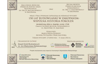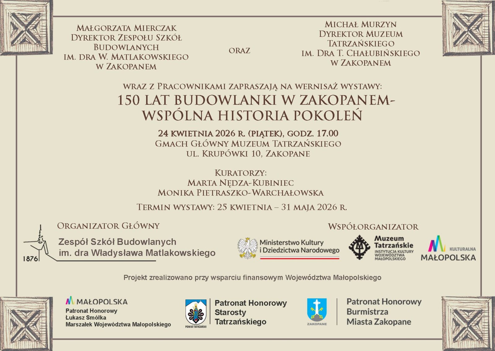 Małgorzata Mierczak Dyrektor Zespołu Szkół Budowlanych im. dra Władysława Matlakowskiego w Zakopanem oraz Michał Murzyn Dyrektor Muzeum Tatrzańskiego im. Dra Tytusa Chałubińskiego w Zakopanem wraz z Pracownikami mają zaszczyt zaprosić na wernisaż wystawy "150 lat Budowlanki w Zakopanem – wspólna historia pokoleń".