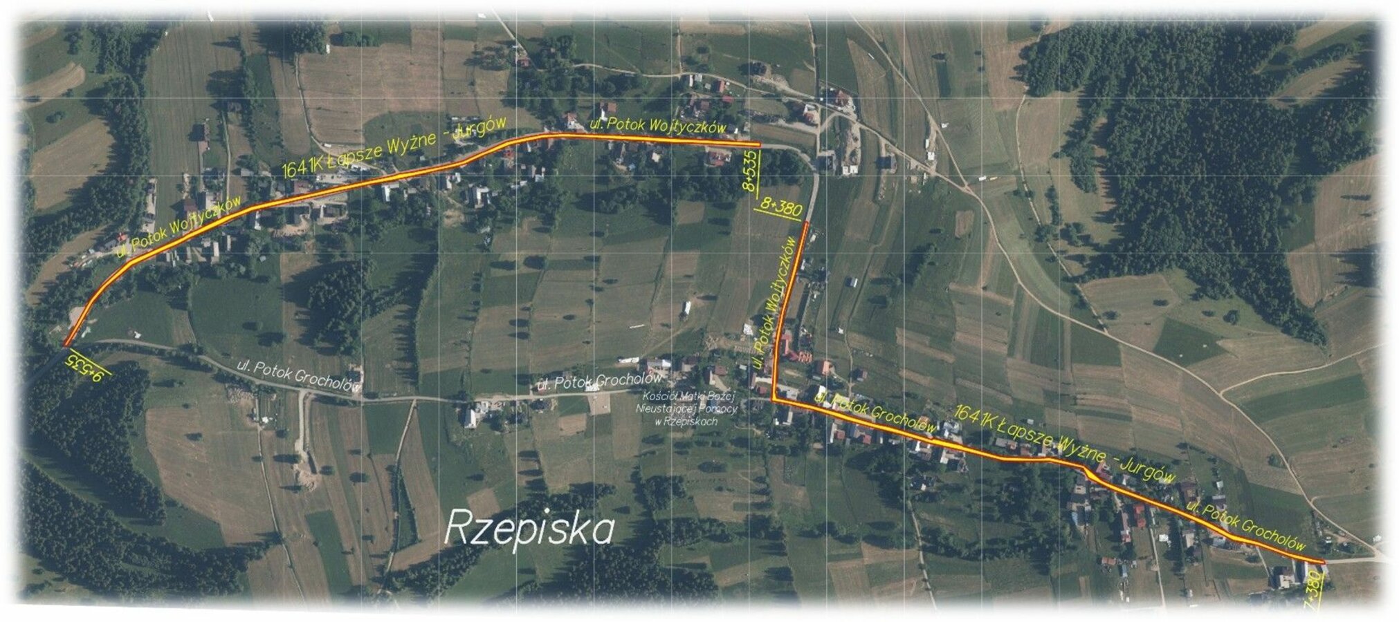 Lokalizacja tablicy informacyjnej – „Przebudowa drogi powiatowej nr 1641K Łapsze Wyżne – Jurgów od km 7+380 do km 8+380 oraz od km 8+535 do km 9+535 w miejscowości Rzepiska – powiat tatrzański”